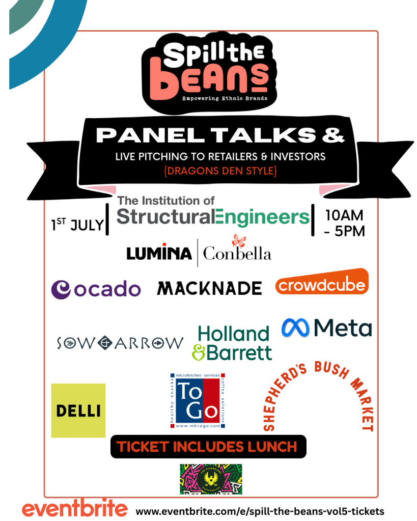 Spill the Beans, UK’s only event for Black/ethnic FMCG producers to get in front of Supermarket Buyers & Investors, Dragon Den Style.